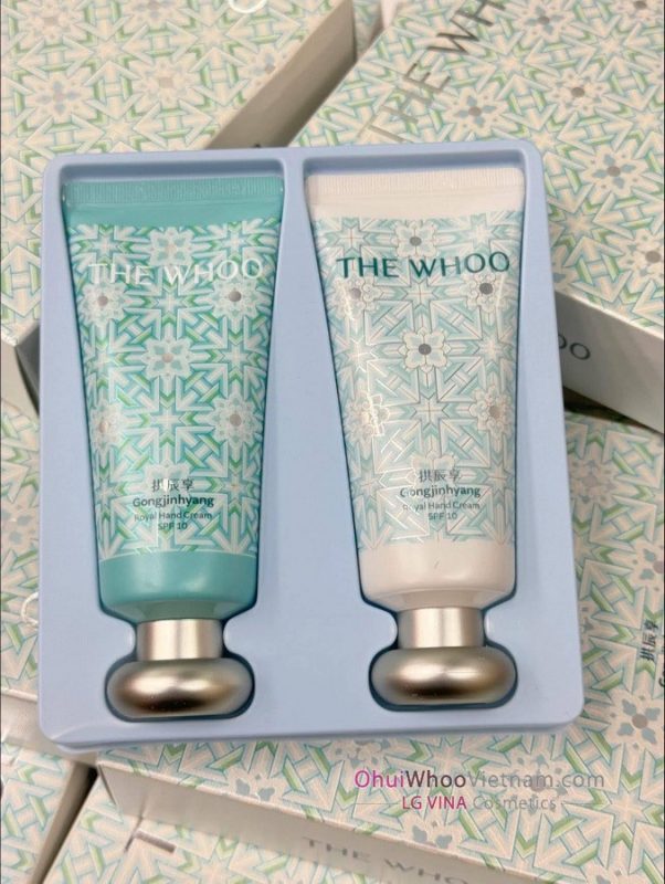 - Kem dưỡng da tay chống nhăn Whoo Royal Hand Cream SPF10, cải thiện tình trạng thô ráp và khô da. Phục hồi độ săn chắc bằng cách nuôi dưỡng, giữ ẩm đồng thời bảo vệ da trước các tác động của tia tử ngoại.