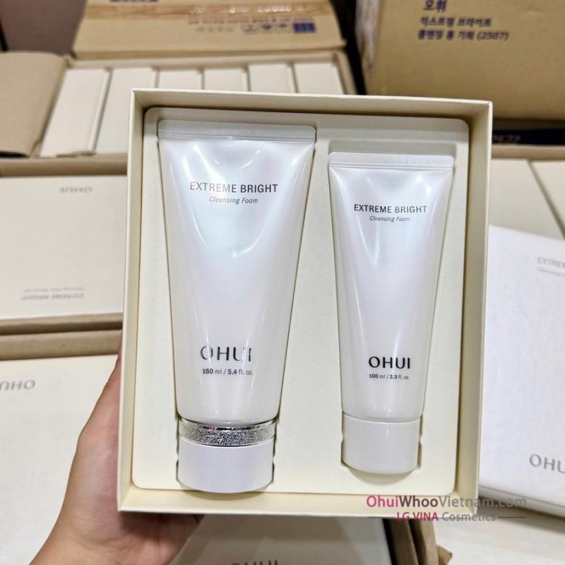 Set Sữa Rửa Mặt Ohui Extreme Bright là bộ đôi tiện lợi và kinh tế. Bộ sản phẩm bao gồm tuýp Full Size 160ml và tuýp Du Lịch 100ml tặng kèm. Sản phẩm thuộc dòng Extreme Bright nổi tiếng của Ohui. Dòng này tập trung vào công nghệ làm sáng da cao cấp. Điểm nổi bật nhất là công nghệ Snow Vitamin™ độc quyền. Công nghệ này tạo nên lớp bọt mịn, đặc và xốp như tuyết. Lớp bọt len lỏi sâu vào lỗ chân lông. Nó nhẹ nhàng cuốn trôi mọi tạp chất, tế bào chết và cặn bẩn. Quá trình làm sạch hoàn toàn không gây ma sát hay kích ứng da. Thiết kế sang trọng với tông trắng tinh khôi thể hiện đúng tinh thần dưỡng trắng của sản phẩm.